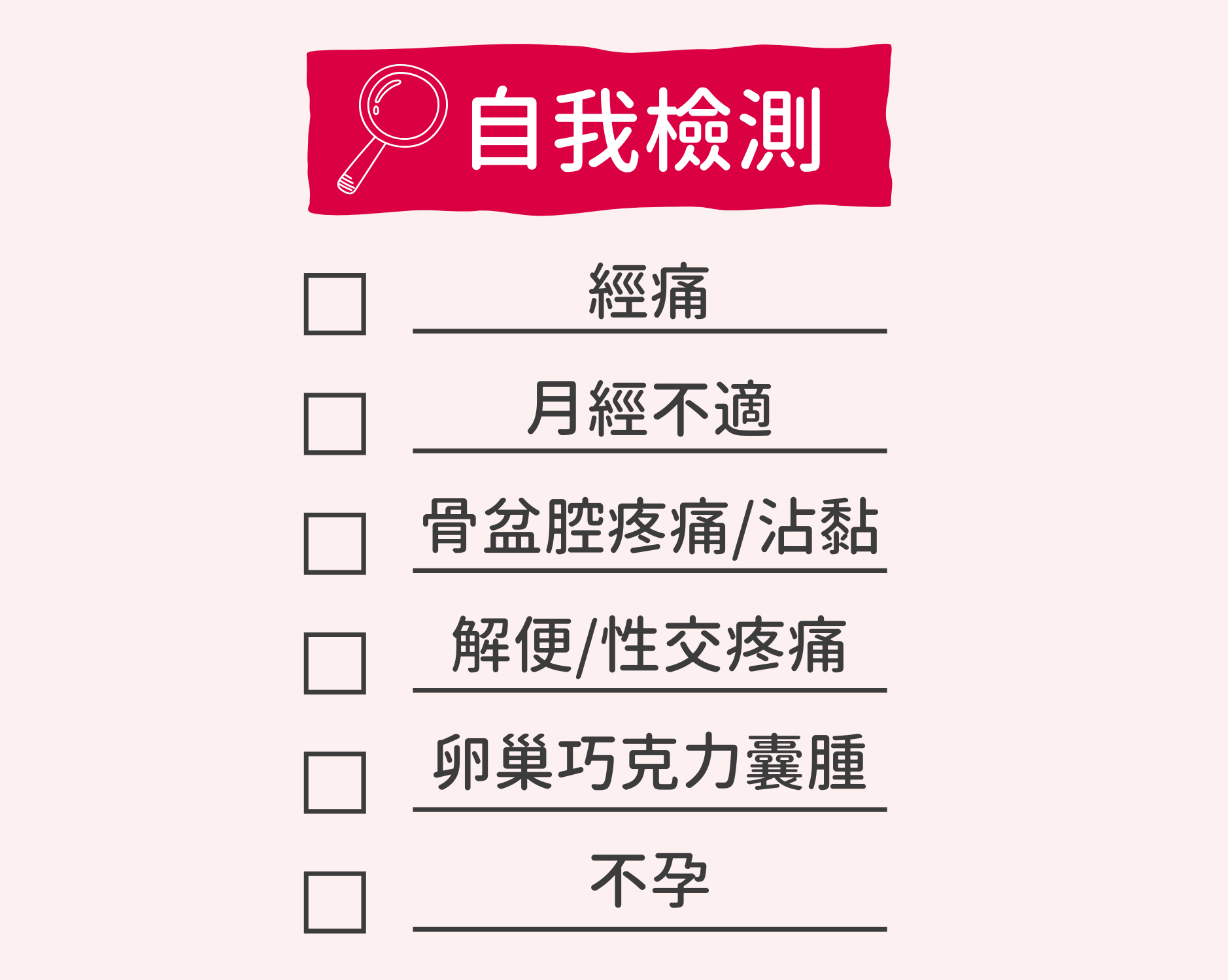 女性朋友可以依據上述子宮內膜異位症的症狀做自我檢測,若有懷孕的困擾則要高度懷疑是否有子宮內膜異位症的存在。