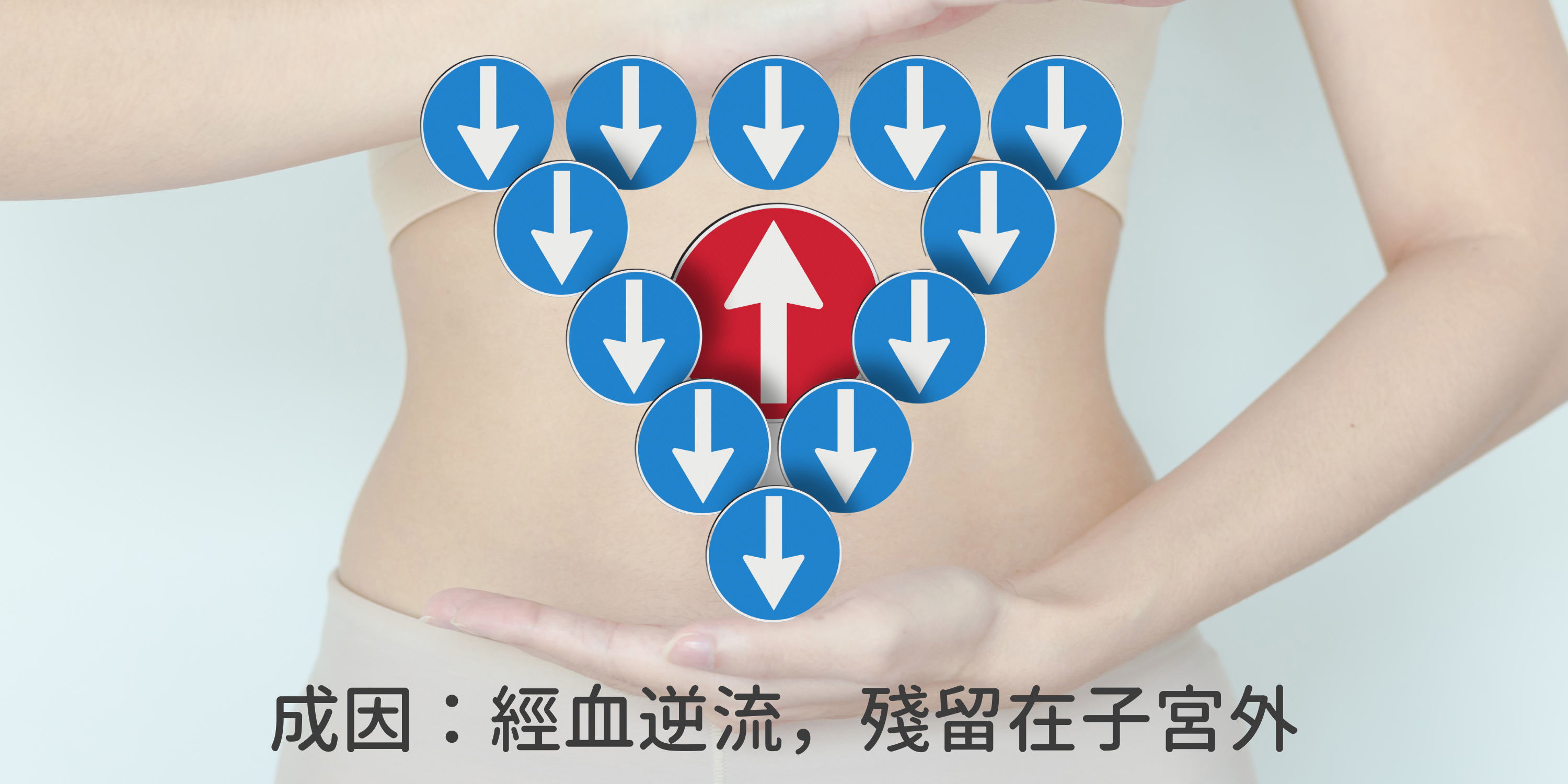 子宮內膜異位症的成因一般認為是經血逆流所致。月經來時,經血一般是由子宮頸向陰道順向外流,但同時也有少量經血會由輸卵管向體內骨盆腔逆向流動。滯留在體內骨盆腔的經血會由人體的免疫細胞將之清除殆盡,若是逆流的經血過多或是免疫系統無法將逆流的經血清除乾淨,就有可能造成殘留。殘留經血中的子宮內膜組織一旦在子宮以外的地方生長,日積月累就會造成子宮內膜異位症。