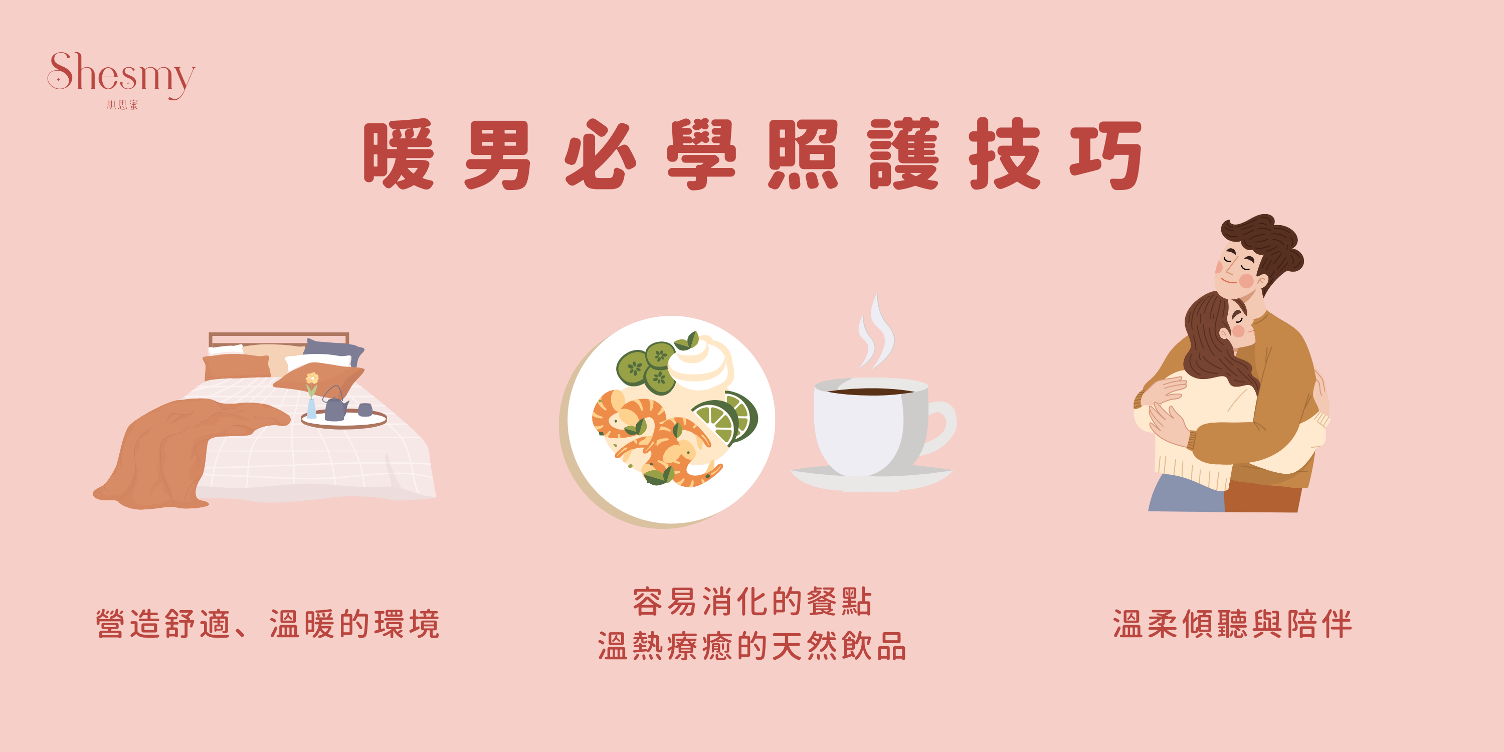 因此,所謂的「生理痛」,並不一定只有下腹部疼痛,極大可能還牽動了其他地方的不適感,女性生理期時無論身心都是相當脆弱、易感的狀態,在這幾天想要好好照顧她,你可以從各個方面給她需要的照護。