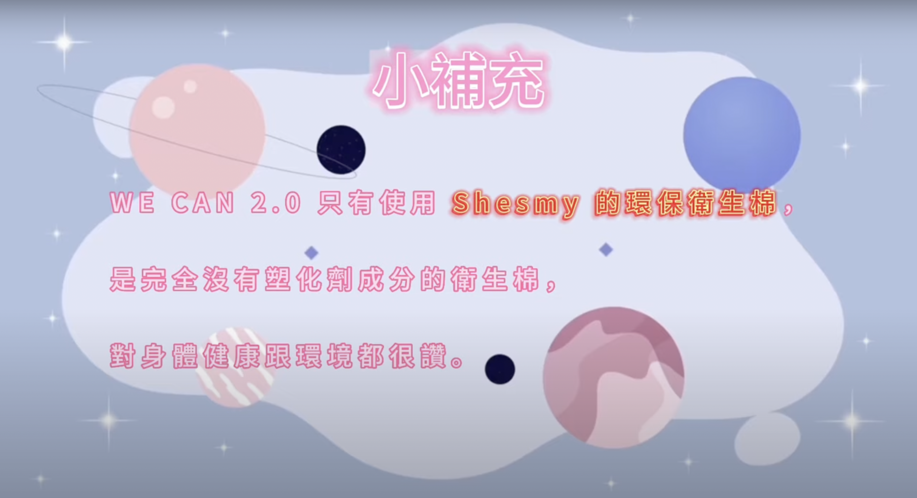 以「不塑經期」為主題,與國家未來棟樑們一起交流,在演講之前,學生會就有執行「we can」計畫,即在校園廁所中擺放衛生棉供需要的人使用,由於認同 SHES 的理念,近期也推出「we can 2.0」 放置 Shesmy 無塑衛生棉,也是台灣第一所落實不塑經期的校園。