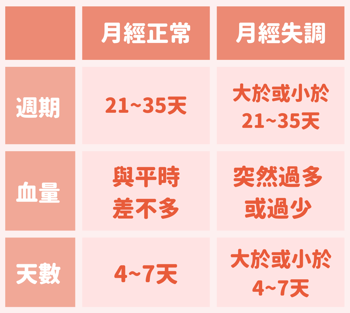 月經失調的情況包含月經週期、月經經血量、月經持續天數的太多、太少、或不規律。