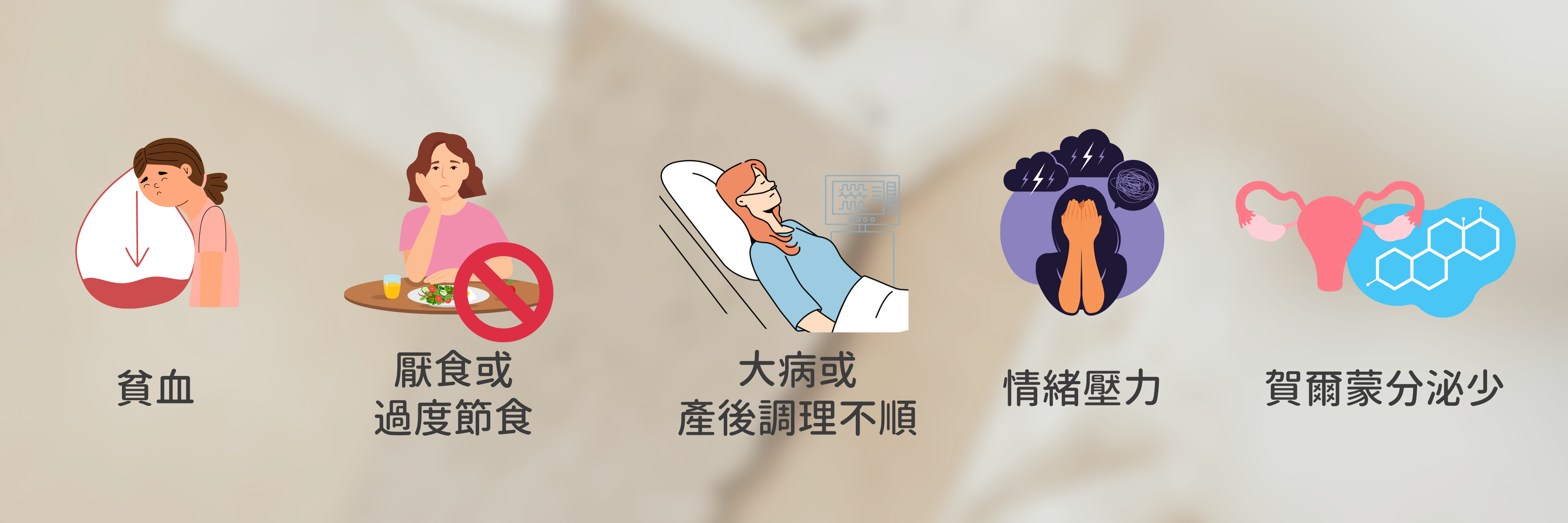 月經週期主要是受到腦下垂體、卵巢、下視丘的調控,而當遇到課業、考試、工作、家庭、感情等因素,造成疲勞或情緒及壓力起伏較大時,都會影響上述中樞系統分泌荷爾蒙、黃體激素等相關激素,造成月經週期提早或延遲,或經血量變得過多或過少。除此之外,過度的減肥手段或藥物的干擾,也會影響激素的分泌,因此,影響生理期週期、經血量、持續天數的原因有很多,若發現有很明顯或連續幾個月都有異常的狀況,建議可以就醫尋求協助,找出真正的原因後對症下藥。