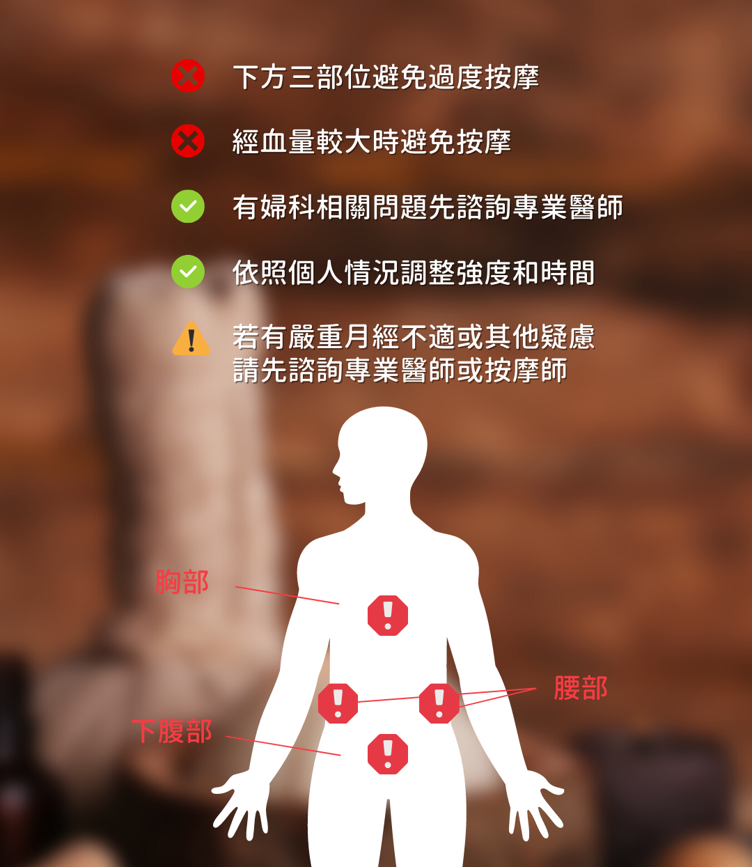 月經期間是否進行按摩應依個人身體情況做判斷,根據自己的舒適度和醫生的建議做出決定。如果在進行月經期間按摩,記得遵循適當的按摩技巧和注意事項,以緩解不適並提升身體舒適度。