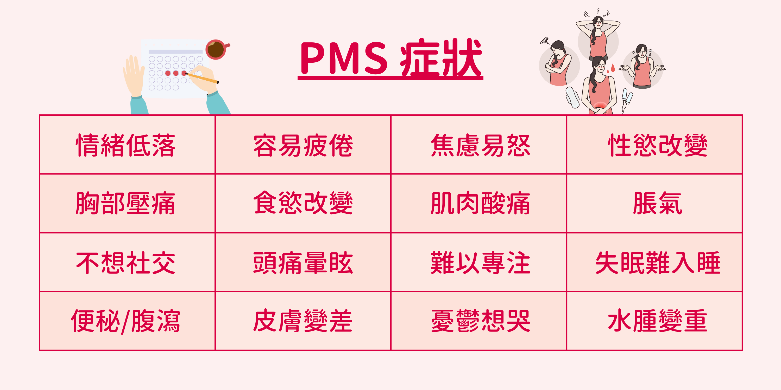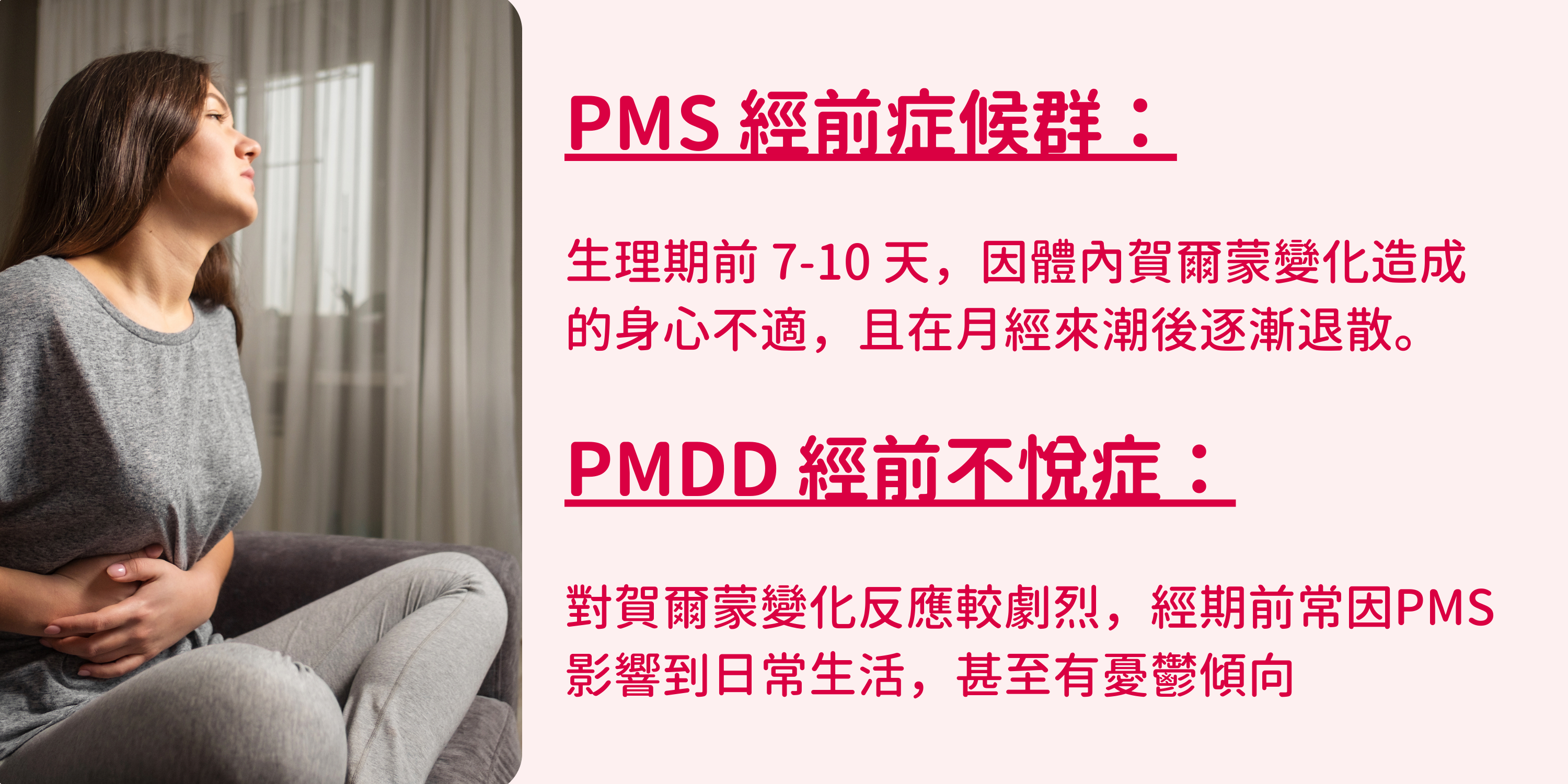PMS(Premenstrual Symptoms)是指「經前症候群」,說明經期前 7-10 天,因體內賀爾蒙的變化而出現的一系列不舒服現象,且在月經來潮後逐漸退散,根據國外統計,約有 3/4 的女性曾經歷 PMS 經期症候群,且依照每個人體質不同,所經歷的症狀與嚴重程度都不相同,有些人體質對於賀爾蒙的變化反應較劇烈,每次經期前都會因 PMS 影響到日常作息、人際社交活動,甚至有憂鬱傾向,這樣的情況被稱為 PMDD(premenstrual dysphoric disorder)也就是「經前不悅症」,如有這樣的狀況,建議尋求專業的協助。