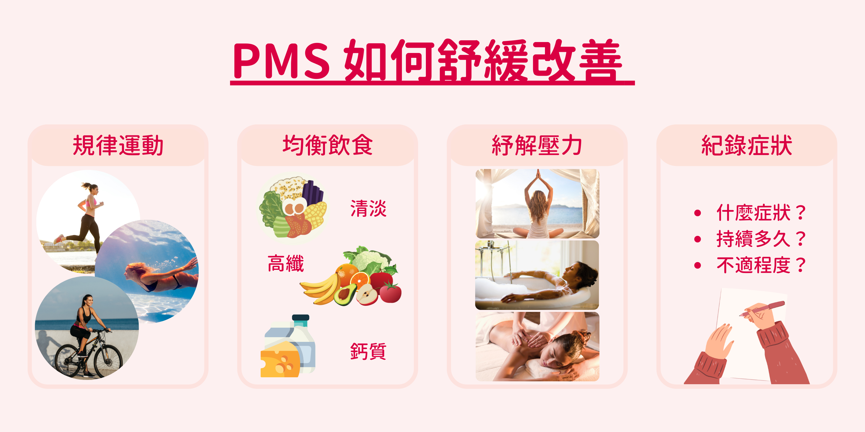 改變生活型態,培養規律的運動習慣,可採取少量多餐的高纖飲食,避免過甜、過鹹及刺激性食物如酒精、咖啡,補充鎂、維他命B6、維他命E,保持充足睡眠,適時緩解壓力,並養成記錄症狀的習慣,了解自己的狀況並推測可能原因,也能更即時的尋求幫助並改善症狀哦!