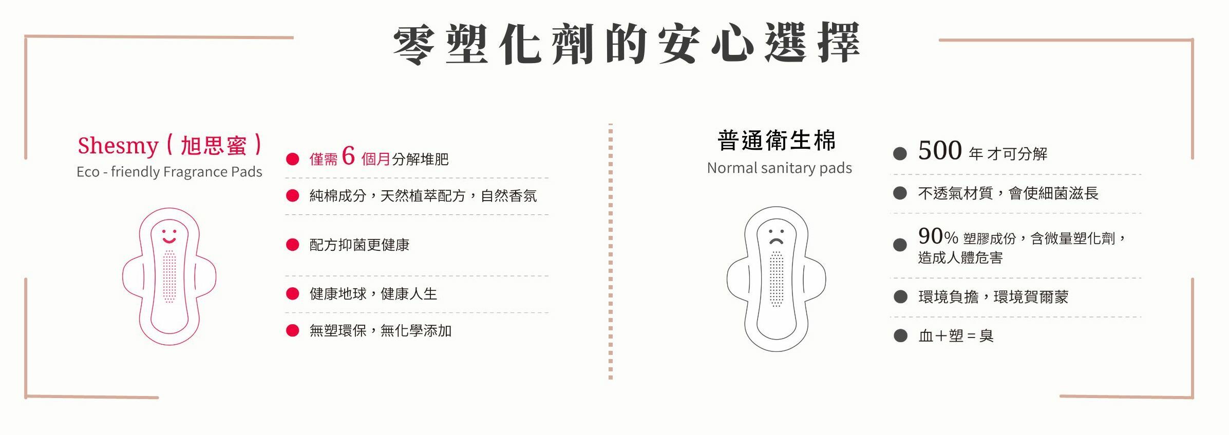 Shesmy 是台灣第一款 100% 零塑膠、6 個月可自然分解的衛生棉,讓生理期杜絕塑化劑干擾,親膚、透氣、健康又永續!天然植萃精華更經 SGS 認證長達 4 小時 99.9% 抑菌,為目前業界最高標準!Shesmy 體貼你的生理期,不用改變生活習慣,也能輕鬆愛自己愛地球的最佳選擇!