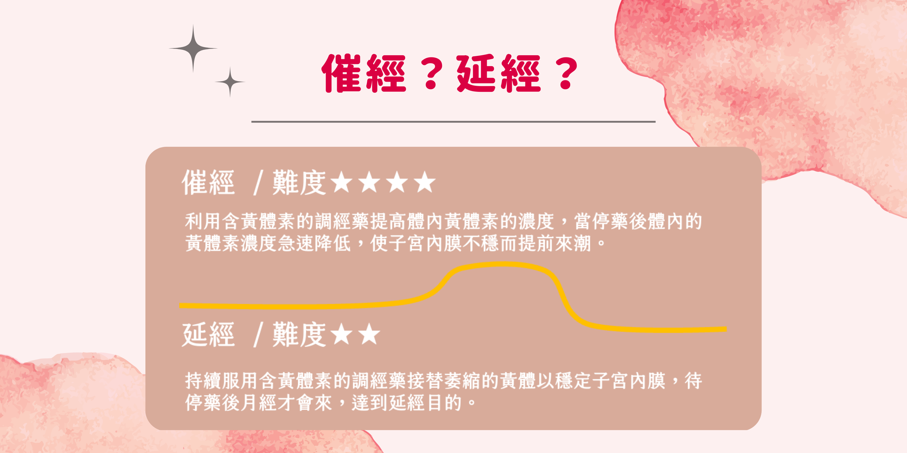 催經、延經,其實都是在利用「黃體素」模擬月經行程以達目的。還記得上一段落,我們說到經期會在「黃體素濃度急速降低」後,子宮內膜不穩定造成月經來潮,因此,只要持續一段時間補充黃體素,在突然停止後就會造成「黃體素濃度急速降低」,讓經期提前到來;反之,在體內停止分泌黃體素後,透過補充黃體素,維持體內黃體素濃度,穩定子宮內膜,即可達到延經目的。