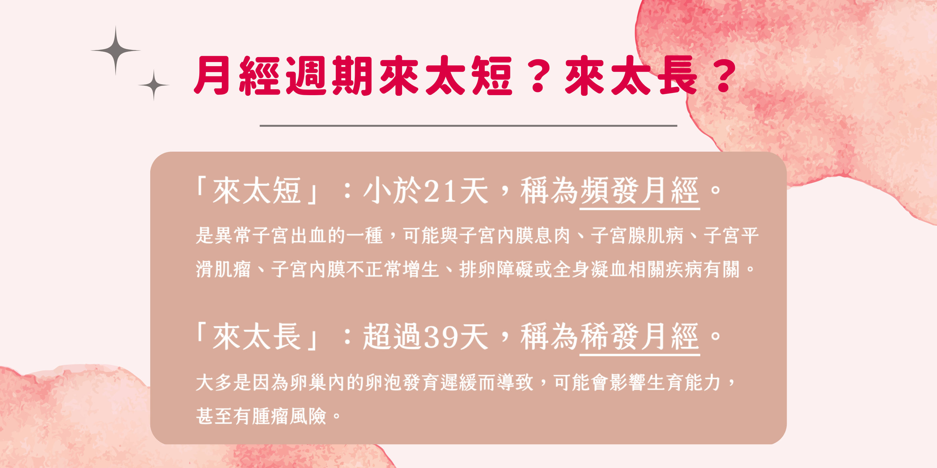 月經週期的計算是從「月經來的第一天」到「下一次月經來的第一天」之間的天數,一般人平均天數為 28-35 天。若天數小於 21 天,屬於「來太短」,此為「頻發月經」,為異常子宮出血的一種,可能與子宮內膜瘜肉、子宮腺肌病、子宮平滑肌瘤、子宮內膜不正常增生、排卵障礙或全身凝血相關疾病有關;若天數超過 39 天,屬於「來太長」,此為「稀發月經」,多數由卵巢內濾泡發育遲緩而導致,可能影響生育能力,甚至有腫瘤風險。