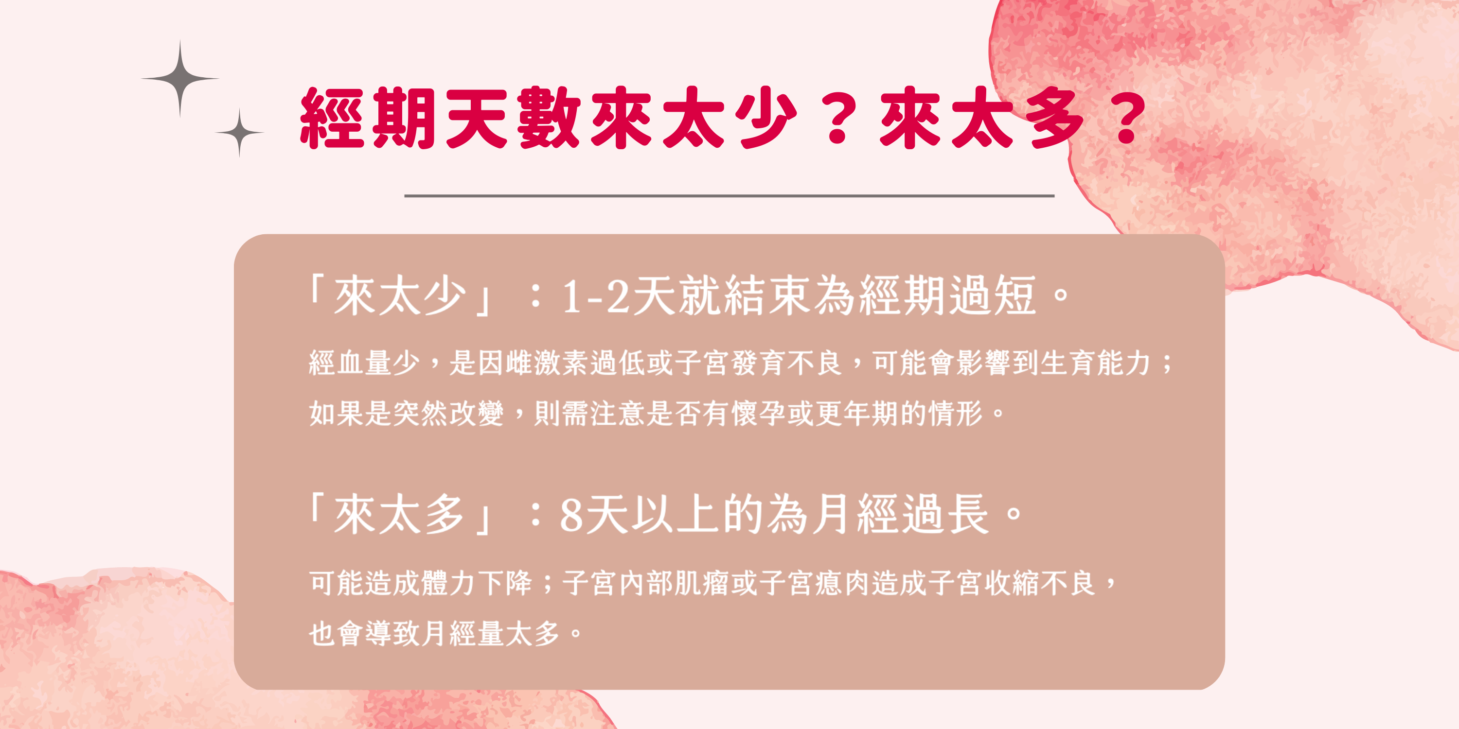 經期天數一般約為 5-7 天,若「經血過少」可能造成經期天數約 1-2 天就結束,此為經期過短,屬於「來太少」,主因為雌激素過低或子宮發育不良,可能影響生育能力,若是突然變為「來太少」,則需注意是否有懷孕或更年期的情形;若「經血過多」可能造成經期天數超過 8 天以上,此為經期過長,屬於「來太多」,可能為子宮內部肌瘤或子宮瘜肉造成子宮收縮不良,長期恐造成體力嚴重下降。