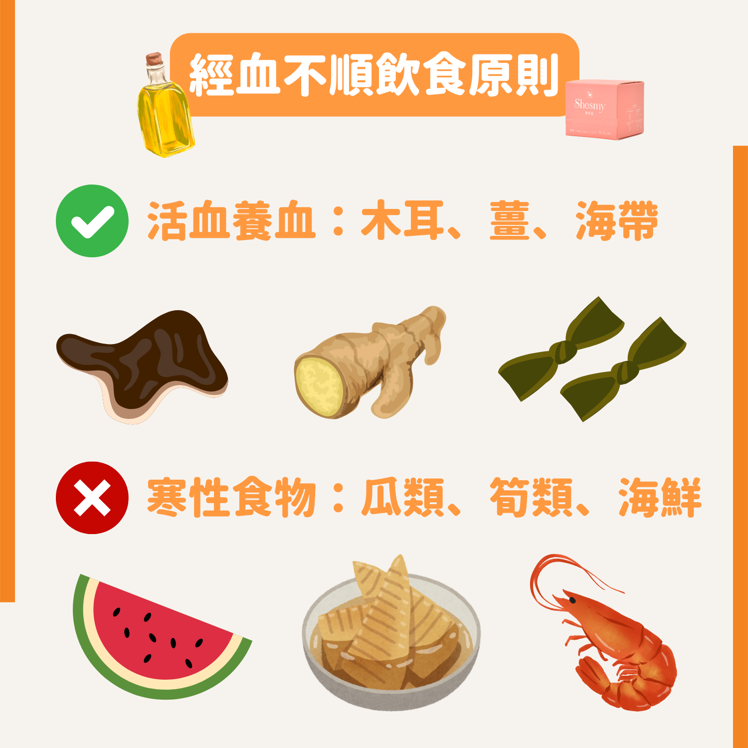 中醫曾說:「寒則凝」,應避免吃過多寒性食物,如瓜類、筍類、海鮮等等。辛辣、油膩、刺激性食物也應儘量避開,免得加劇生理期時腹部的不適感。可多攝取活血、養血的食材,如木耳、生薑、紅糖、黑糖、海帶。