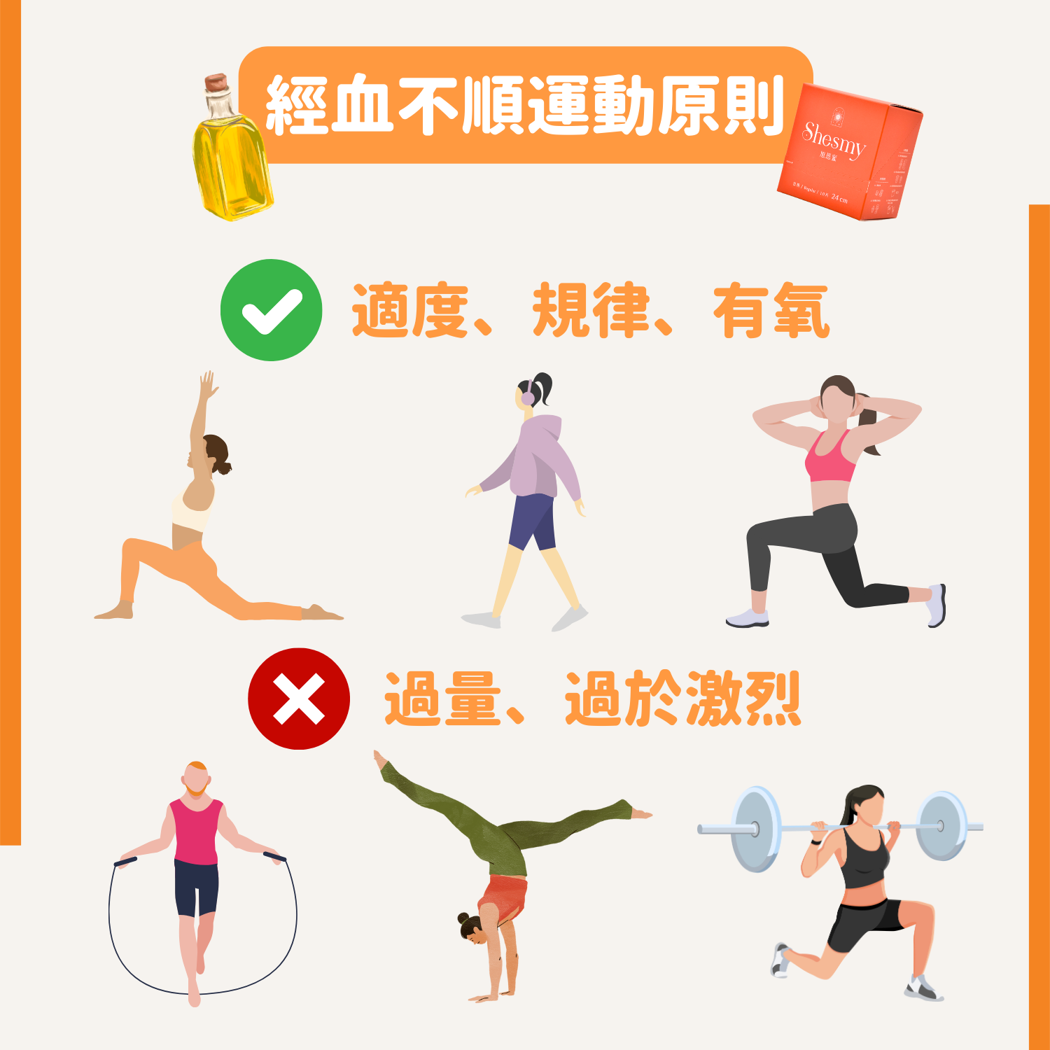 適度、規律的有氧運動,如瑜伽、健走,有利於生理期時的血液循環,也有助於腹部規律收縮,幫助排血、減緩經痛、穩定心情。切記是「適度」的運動,若過量或過於激烈,可能使子宮收縮過快,經痛加劇,出血量遽增。