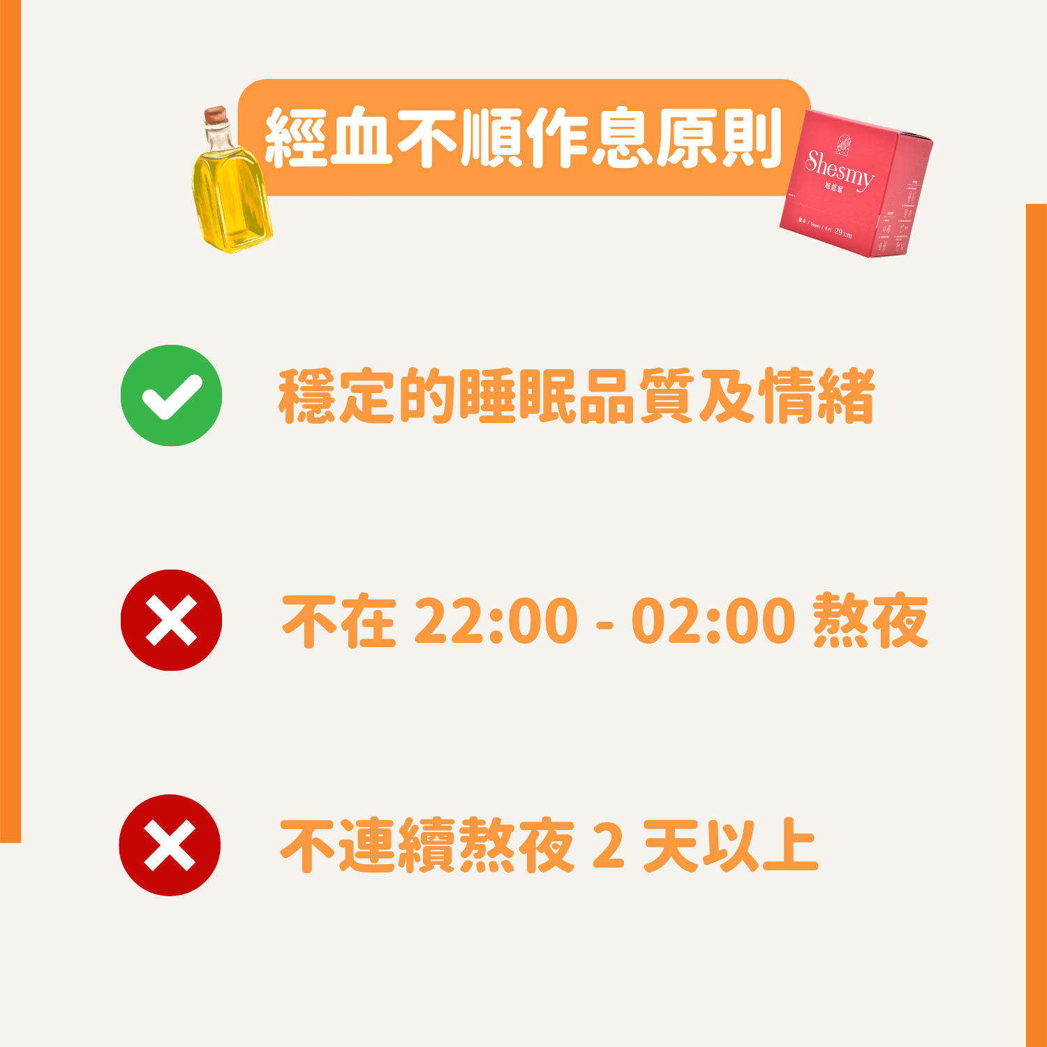 情緒和精神狀況都跟身體內荷爾蒙的變化息息相關,進而影響到排卵時間,導致月經週期、經血量、天數等出現不規律的狀況,因此,擁有良好且穩定的睡眠品質及情緒,也是可以幫助經期穩定的關鍵!