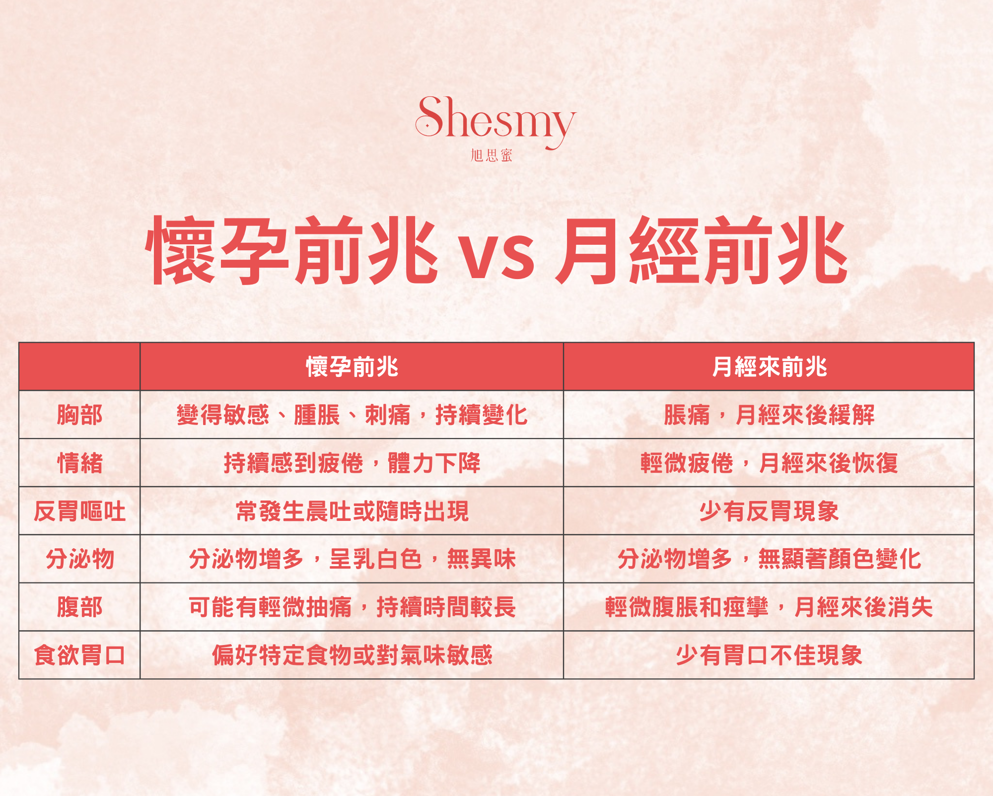 月經來前的徵兆和懷孕前的徵兆有很多很像的地方,容易造成混淆,例如胸部脹痛、容易疲倦、腹痛不適,不過,有一些細微差異可以幫助區分,例如月經來前的症狀通常會持續1~2週,並隨著月經來臨而消失;而懷孕前兆會隨著時間推進而逐漸加重,尤其是噁心和疲倦。