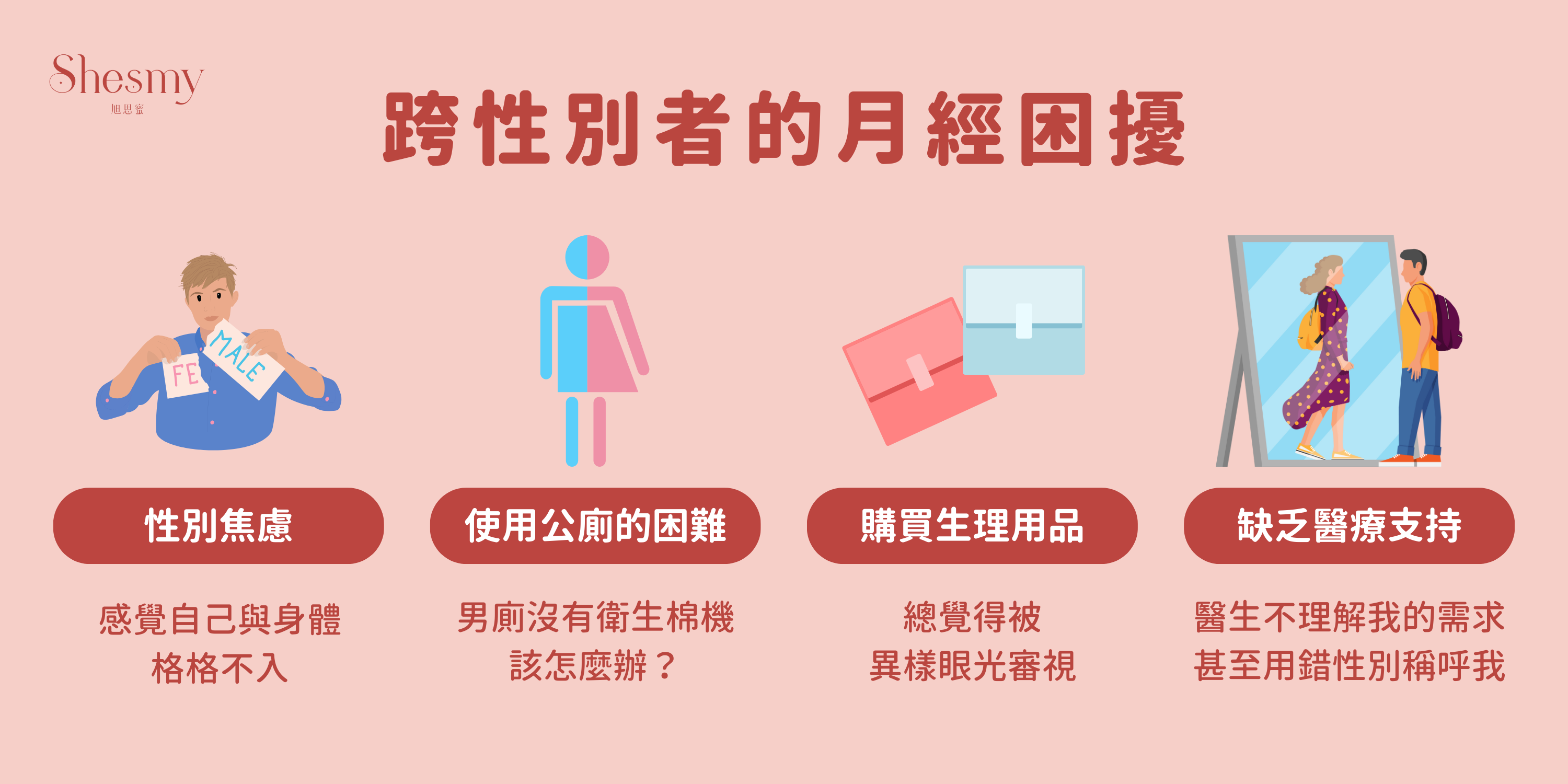 對於這些族群來說,月經的出現可能會帶來性別不安(Gender Dysphoria),使他們在生理與心理上產生強烈的衝突與焦慮。因此,如何打造一個對跨性別者友善的月經環境,是社會應該正視的重要課題。