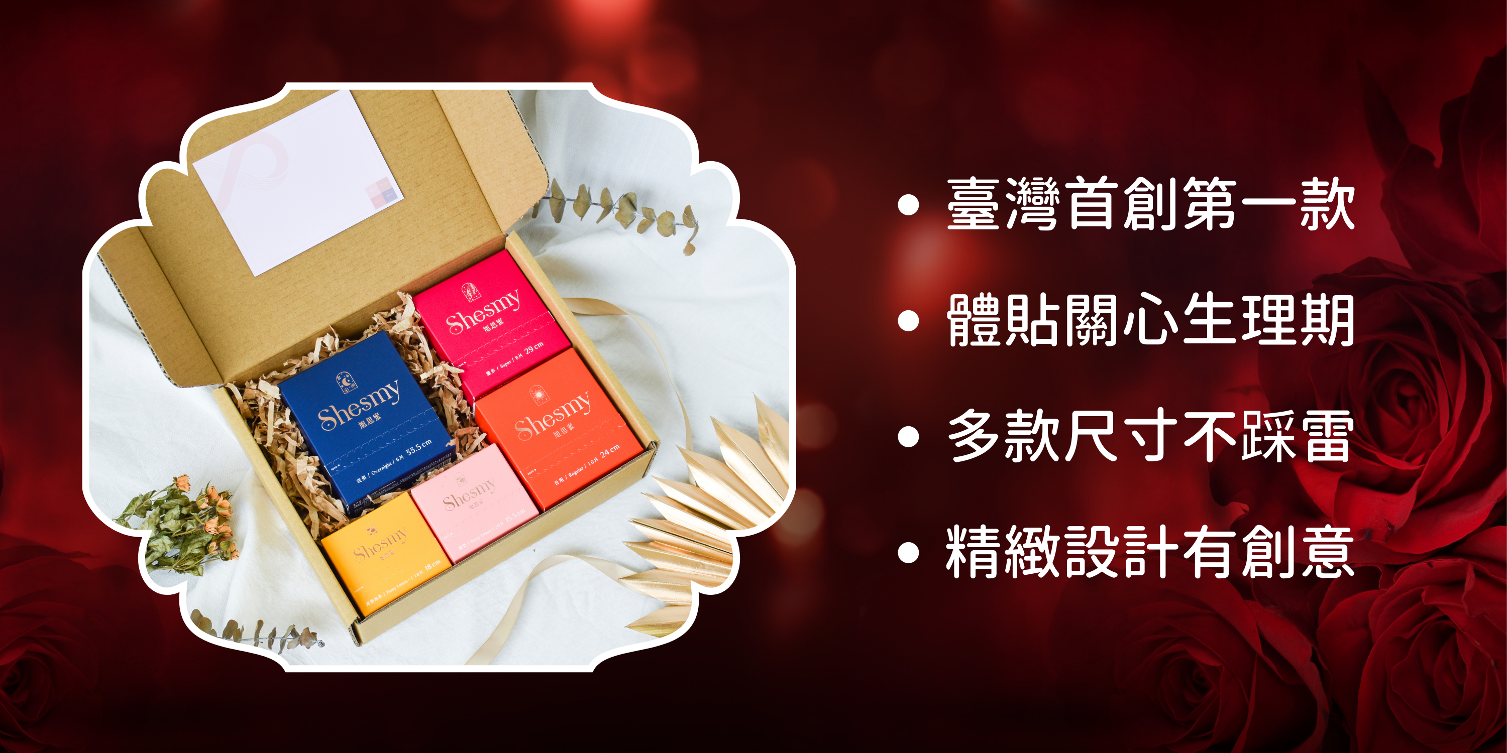 經每次送禮時都在「獨特、實用、浪漫」之間做選擇嗎?SHES 研發的「Shesmy 天然香氛環保護墊/衛生棉」,為臺灣首創 100% 無塑化劑且 6 個月可自然分解的衛生棉,解決許多女性生理期想做環保又期望便利生活的煩惱,精緻外觀設計更受邀參加「2022 台北時裝週」,送這個讓你的禮物「獨特、實用、浪漫」三者兼具!